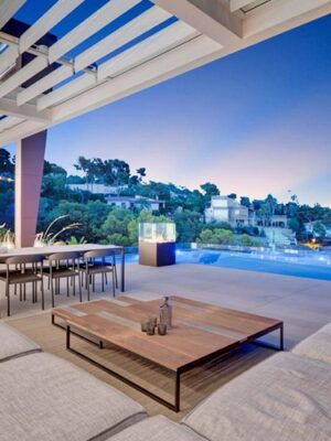 Finca Tramuntana in Santa Maria del Camí: five-bedroom luxury villa with heated pool, helipad, landscaped gardens, terraces, and mountain views.