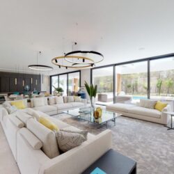Modern three-bedroom villa in Santa Ponsa overlooking the golf course, featuring private and communal pools, sunlit interiors, and a calm Mediterranean ambience.