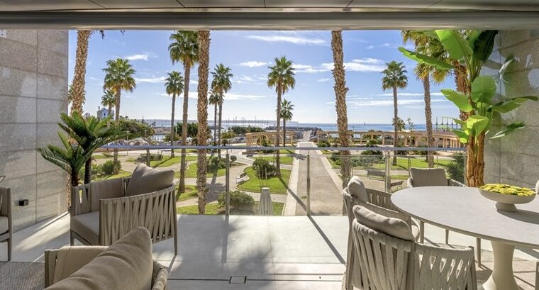 Elegant three-bedroom apartment with sea views, private terraces, and shared pool in Portixol, Mallorca.