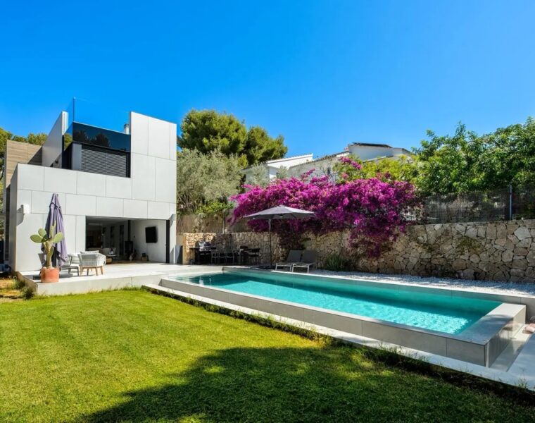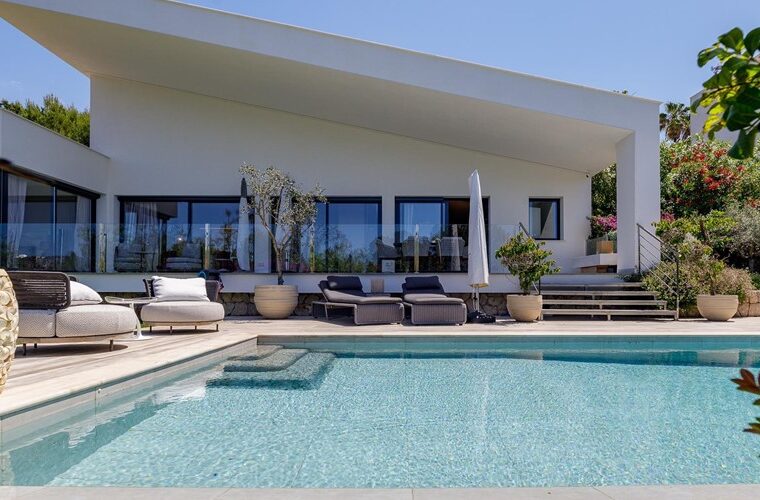 Modern four-bedroom villa with pool and garden in Cala Vinyes, offering elegant interiors, a generous plot, and tranquil Mediterranean living.