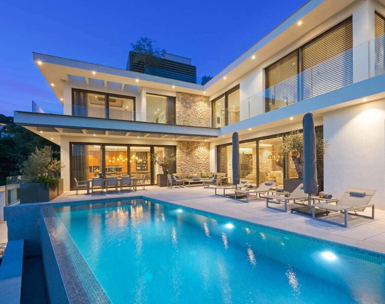 Elegant five-bedroom villa in Port Andratx with panoramic harbour views, rooftop terrace, lush gardens, and refined contemporary interiors—ideal for embracing Mallorca’s slow coastal lifestyle.
