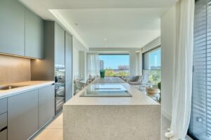 Inside, the layout is centred around a bright open-plan living area framed by floor-to-ceiling windows that draw the sea into the room. Electric panoramic glazing enhances the sense of openness, while the adjoining modern designer kitchen is fitted with sleek finishes that complement the overall contemporary feel.