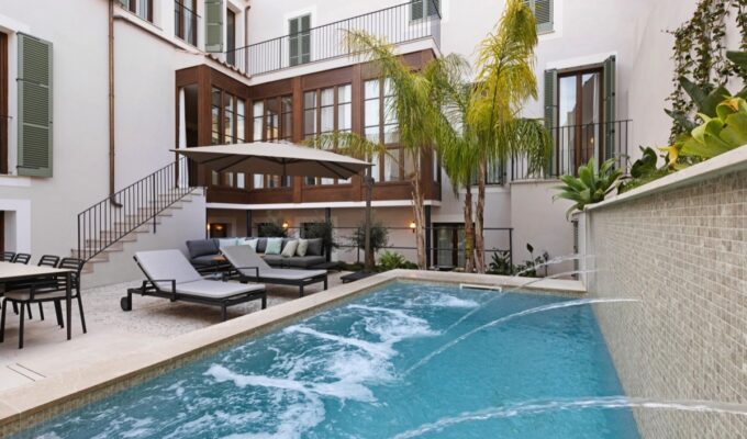 A testament to her talent for transforming a property into something truly exceptional is her work on a family home renovation in Palma, known as GSB. “Initially the owners only wanted to paint the house and change a few things,” she recalls with a smile, “but little by little they grew braver, until we ended up doing a full renovation.” The result is a residence that balances elegance with warmth, defined by calming, rounded lines and the natural rhythm of stone and wood. A spectacular fireplace with a rustic stone base anchors the main living space, its presence softened by chestnut beams and the gentle light of sculptural lamp shades. Tall oak doors and brass inlays add subtle sophistication, while a cinema room and spacious porch reflect the importance of comfort and family life. “Some properties really need the Mallorcan touch,” she says, referencing the wood beams and stone-clad walls, “and others don’t.”