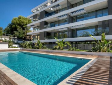 Elegant three-bedroom apartment with sea views, private terraces, and shared pool in Portixol, Mallorca.