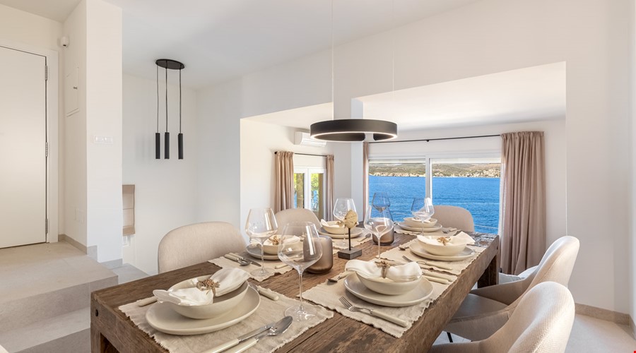 The villa unfolds across two levels, with the upper floor dedicated to an open-plan living and dining space that frames the sea through wide windows. An Italian-designed kitchen blends function and style, creating an inviting centre for everyday life and entertaining. On the lower floor, two comfortable bedrooms and two contemporary bathrooms provide a peaceful retreat. The design emphasises natural light and flowing spaces, enhancing the home’s calm, coastal character.