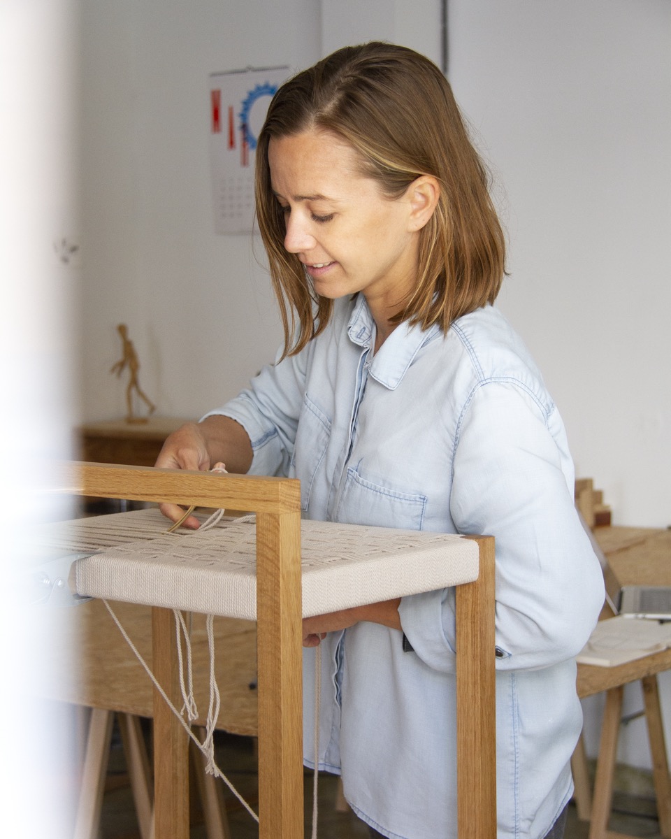 Today, she designs and handmakes modern furniture inspired by these vernacular techniques. Her signature pieces are woven stools, benches, and bedside tables created using recycled cotton cord spun in Spain, sometimes blended with hemp, and framed in local oak. Every design is intentional. “The geometry speaks,” she explains, referencing inspiration from architectural lines, natural gradients, and local motifs like sun-faded fences and shadow lattices. Each piece carries a woman’s name: grandmothers, daughters, friends—quiet tributes to those who have shaped her.